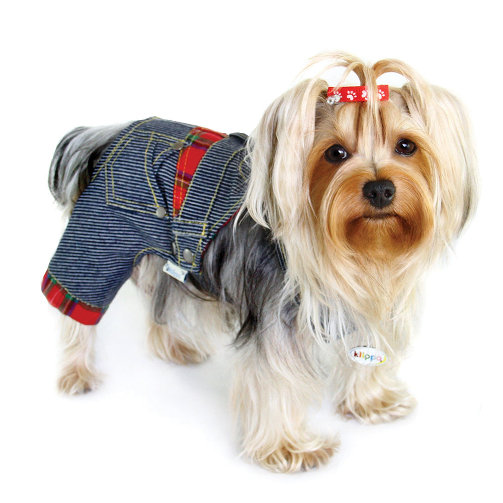 Adorable overall made with striped denim fabric, accented with crossed V-shaped pockets. Two adjustable lengths on the shoulder straps. A small D-Ring attached at the neck area to add on a "Klippo" charm or ID tag! Each outfit comes with a Klippo logo charm. (Size XS fits: Neck 6"~7.5"; Chest 10"~12"; Back Length 6"~8")